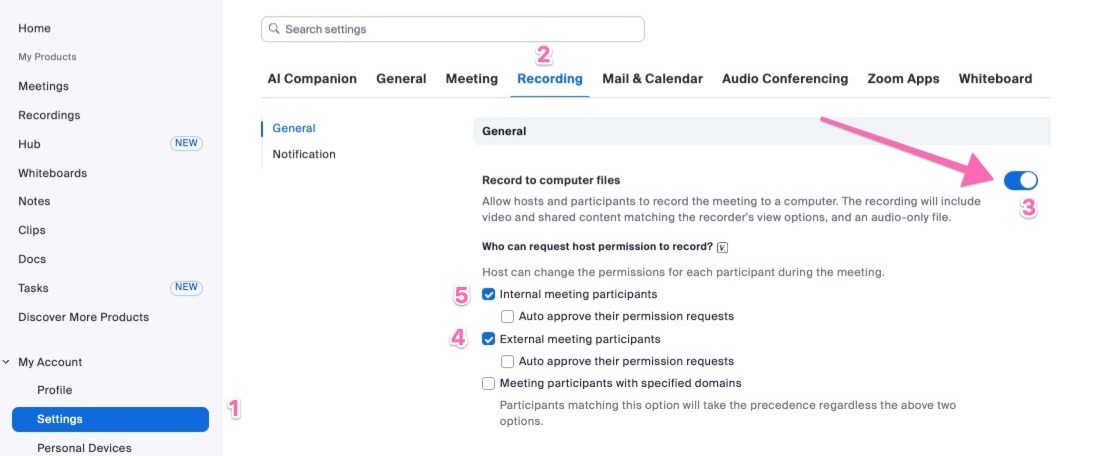 Enable 'Record to computer files' local recording setting: Make sure to enable your global user-level local recording setting in Zoom user settings.
