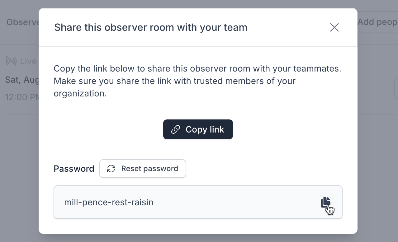 Select 'Share' and then 'Copy Link' to share this Observer Room with your teammates. Make sure to also copy and share the auto-generated unique password.