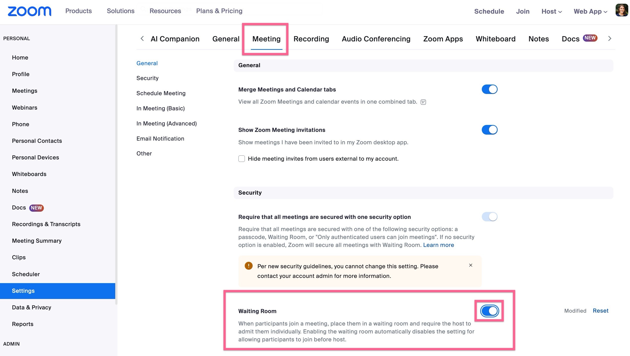 Enable the Waiting Room setting so that when any participants (including the Observer Room "Notetaker" bot) join a meeting, they are placed in a waiting room and require the host to admit them individually.