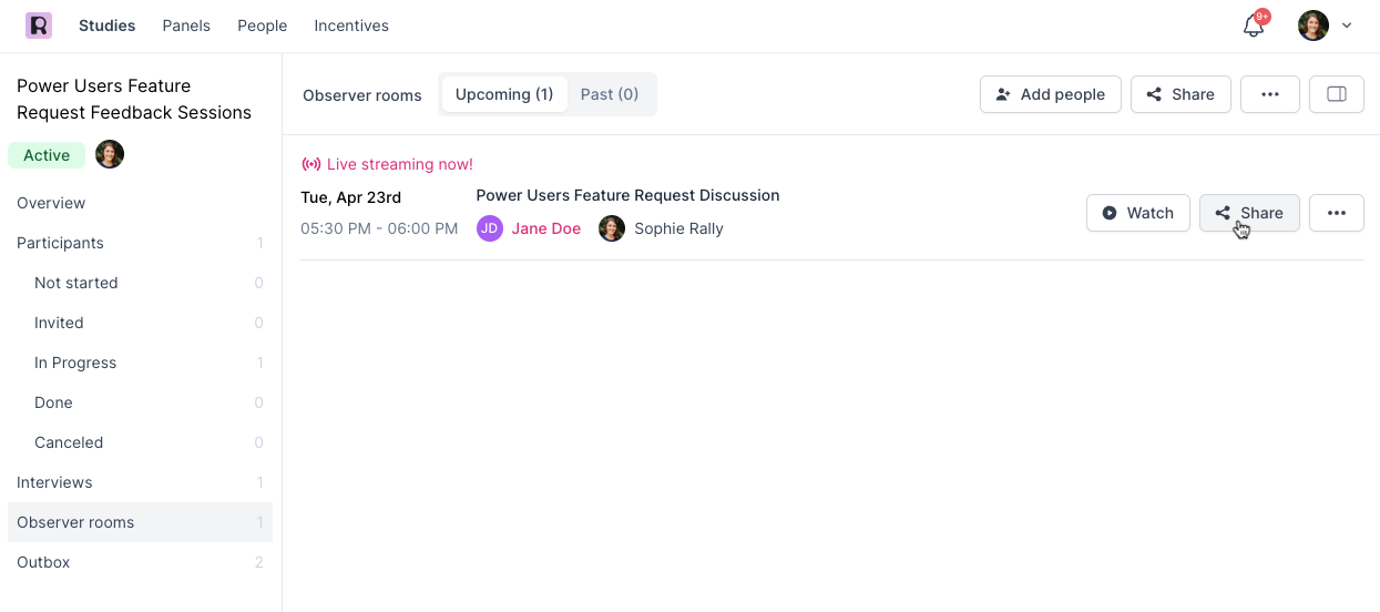 Additional Observers added to Studies after Participants have scheduled interviews will not automatically get email or calendar invites to existing Observer sessions, but they will automatically get email or calendar invites for all future sessions scheduled after they have been added as Observers. Late-addition Observers can also join the Observer Room from the Study Overview page in Rally even if they have not been added. You can also manually add them to the calendar invites of already-created sessions since they should have been created with your calendar.