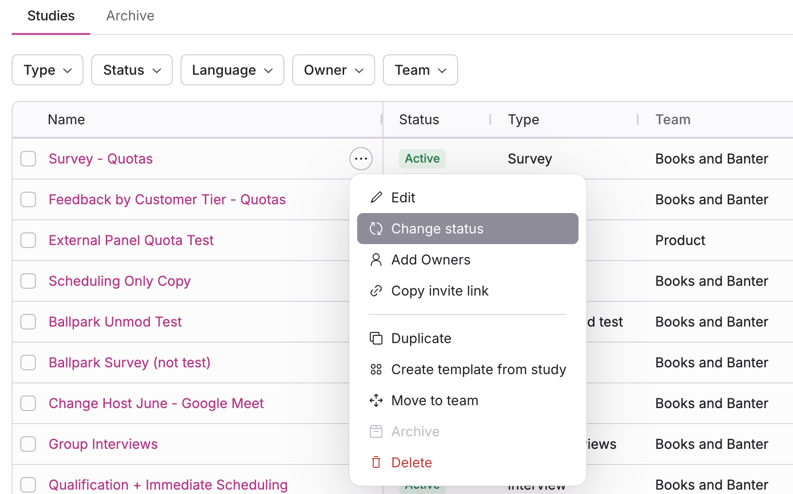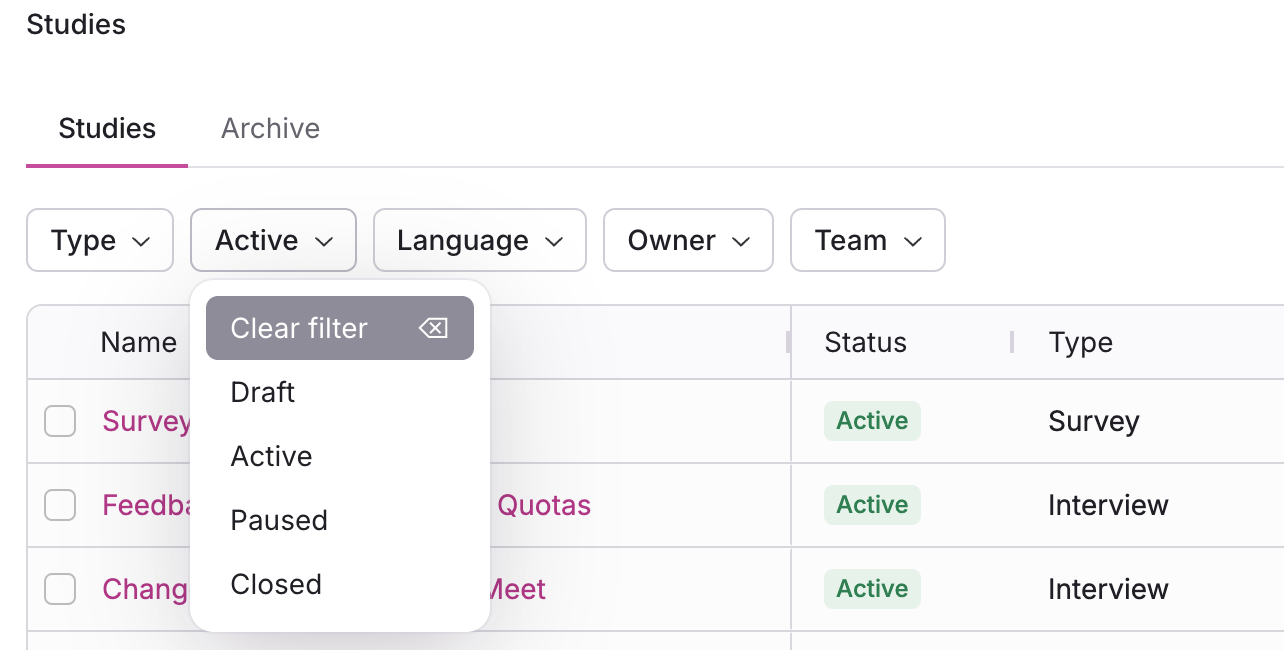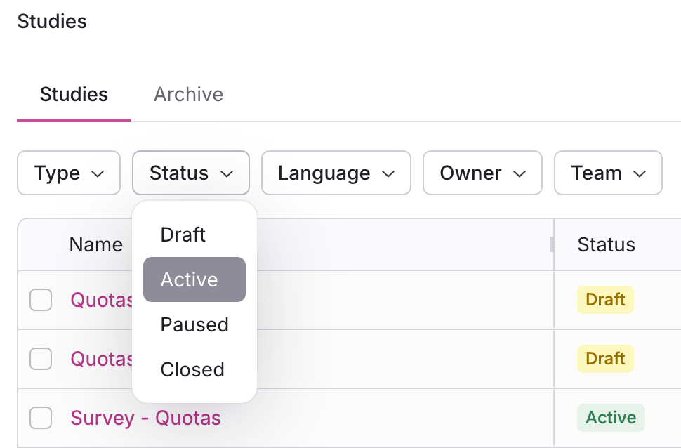 Filter your main studies page to view or find studies with specific statuses using the Status filter at the top of the table. You can also filter the studies table by study type, language, owner, and team.