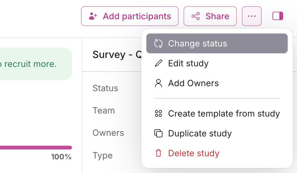 You can also click the color status tag (Active, Paused, Closed) in a study to update.