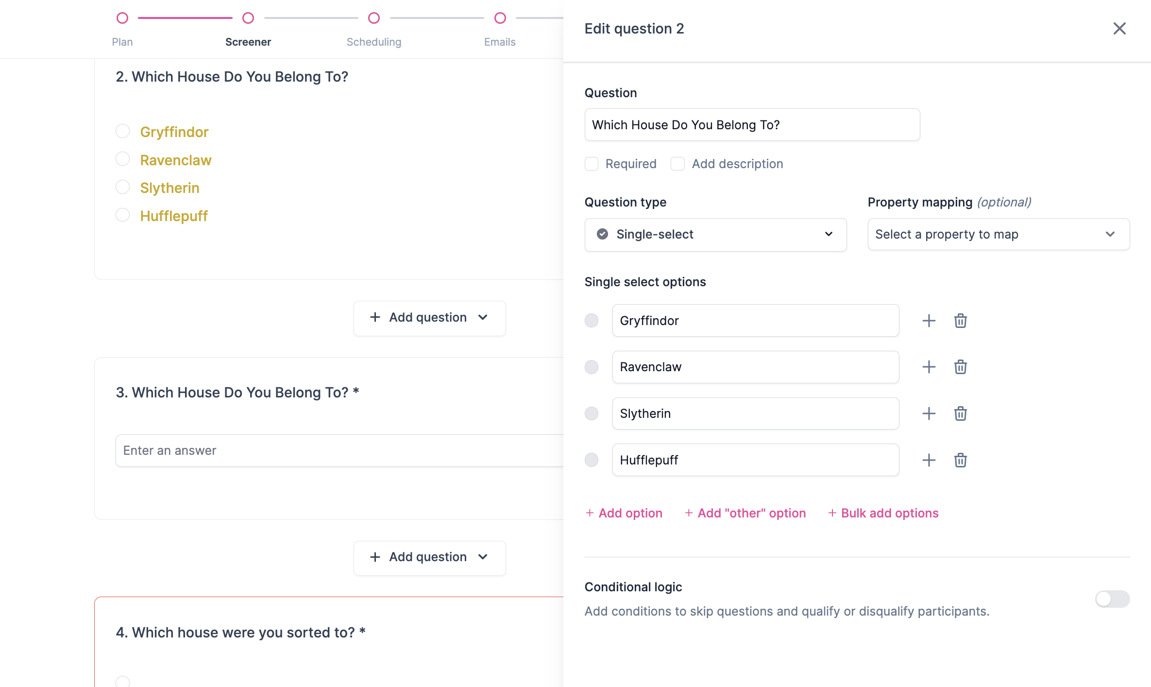 Include a screener when building studies or signup forms to map responses to participant properties, leverage Conditional Logic for automatic qualification and quota assignment, and improve research quality with better recruitment targeting.