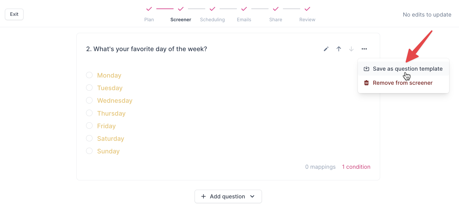 Save as question template: If you'd like to reuse a question in the future, create a new Question Template from any screener question by selecting the 3 dots ... in the top right of a question and selecting 'Save as question template'.