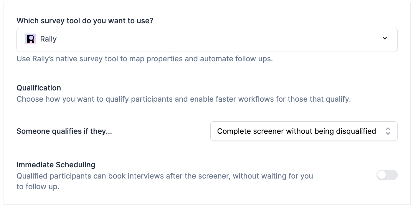 Screener tool: Select your preferred screener / survey tool. Rally's native screener tool is recommended for seamless integration with properties and automated follow-ups. You can also choose from one of our Survey integrations with Qualtrics, SurveyMonkey, or Typeform to enjoy automatic tracking of survey completion within Rally.