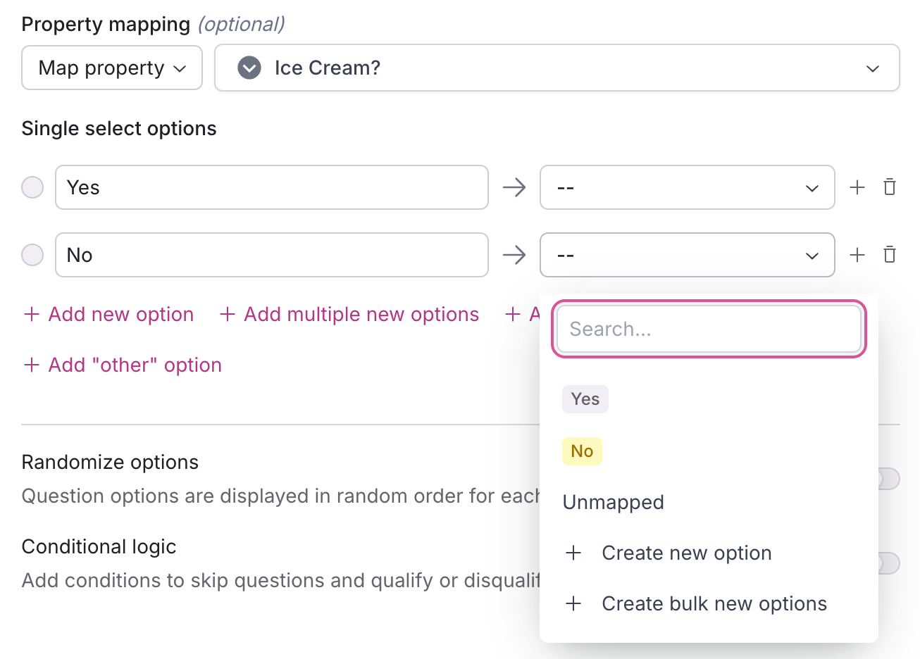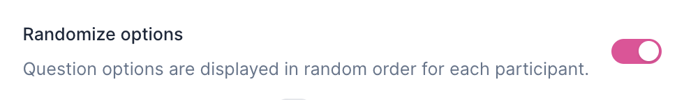 For Single-Select, Multi-Select, or Dropdown question types, you can enable the Randomize Options toggle to display question options in random order for each participant.