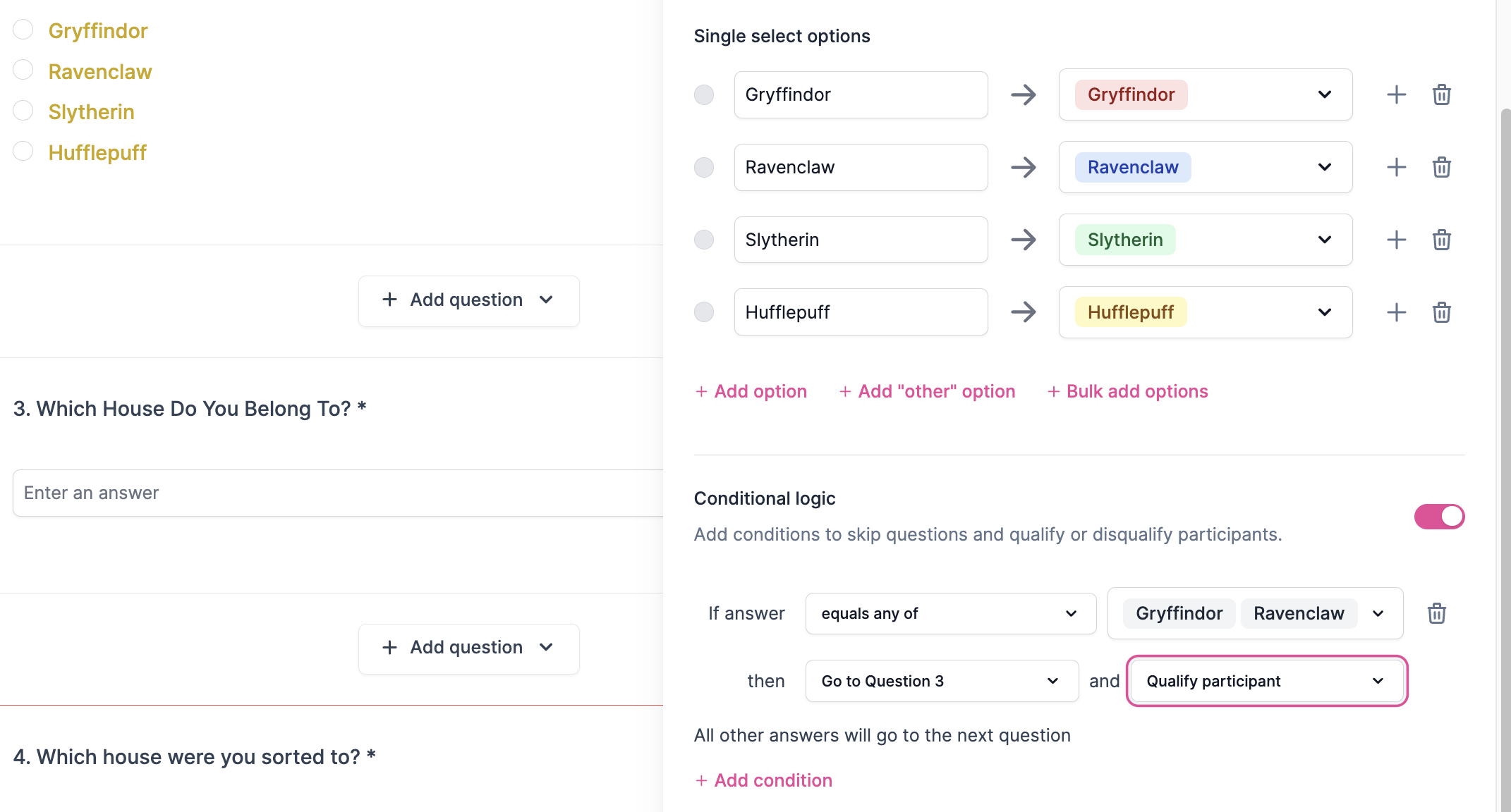 Optionally, enable Conditional Logic to qualify, disqualify, or redirect a Participant to a specific question based on their response to a Single-Select, Multi-Select, or Drop-Down Screener question.