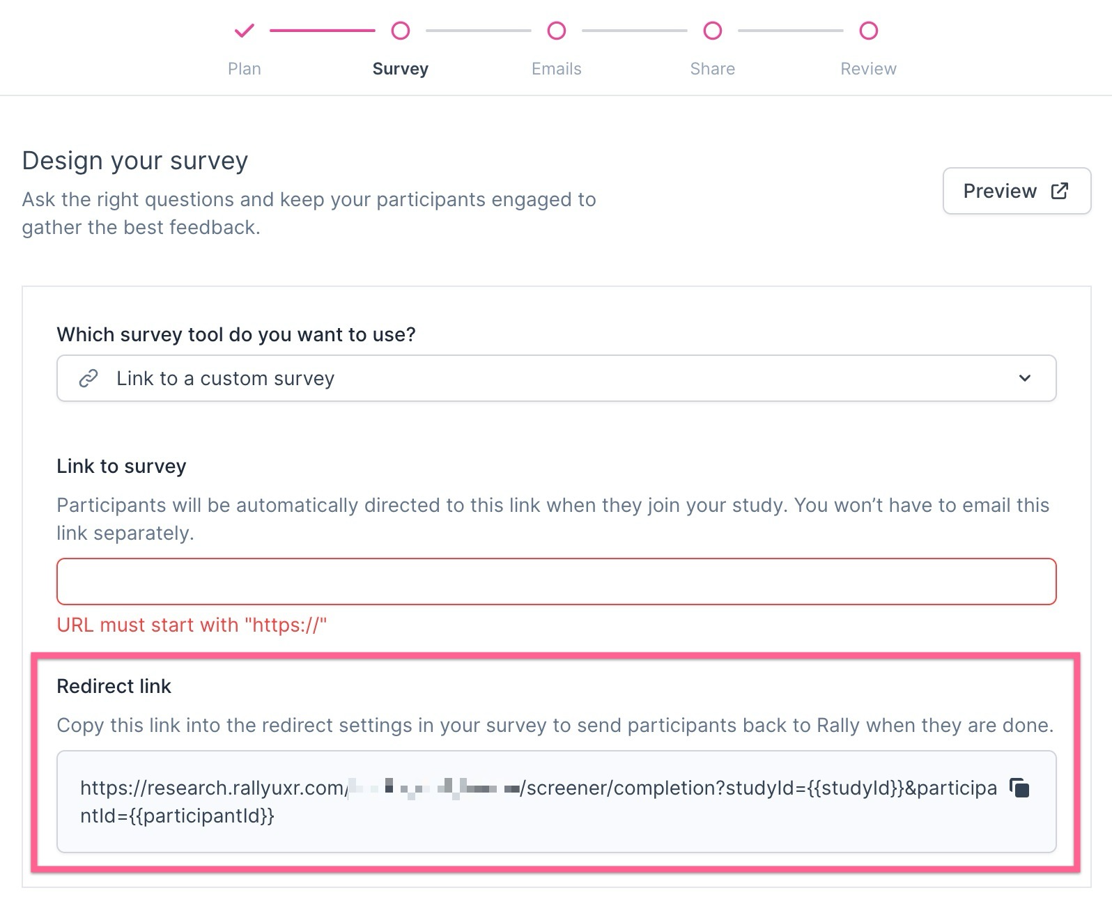 Please note that redirect links for customer screeners or surveys must be enabled on your workspace before completing the steps below. If this feature is not enabled, please contact the Rally Support team to request access.