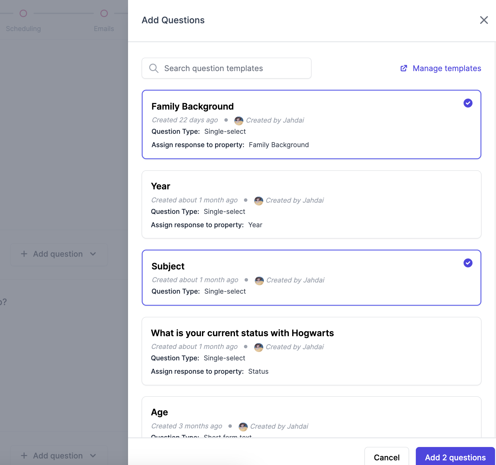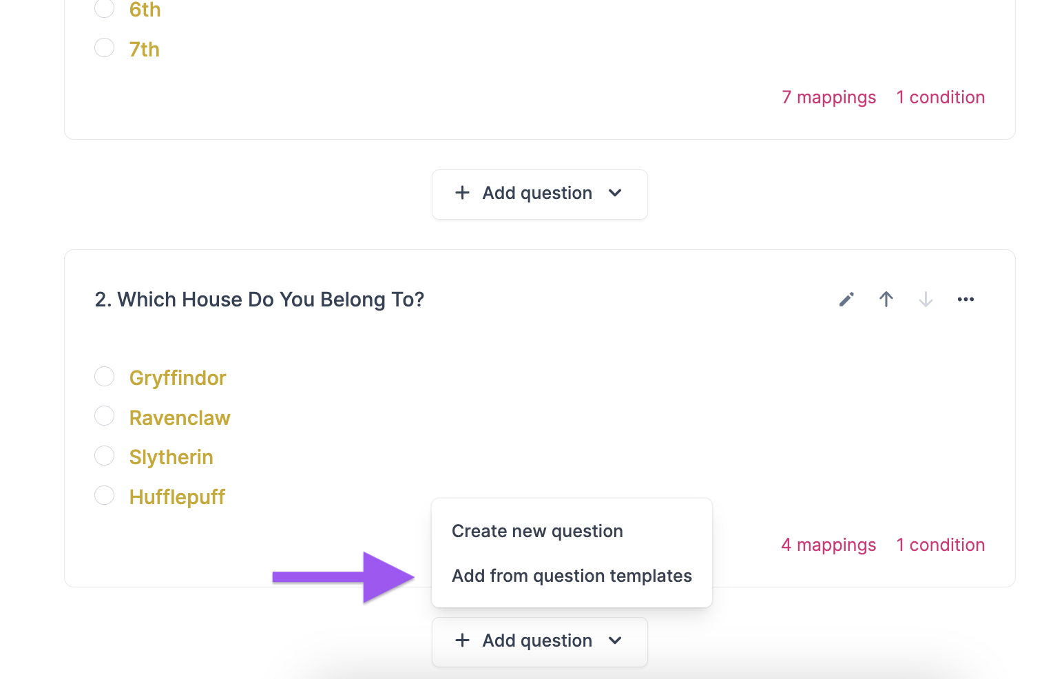 Select each newly added question template to open the editor to make any changes and complete setup, such as marking as required, adding property mapping, or configuring conditional logic.