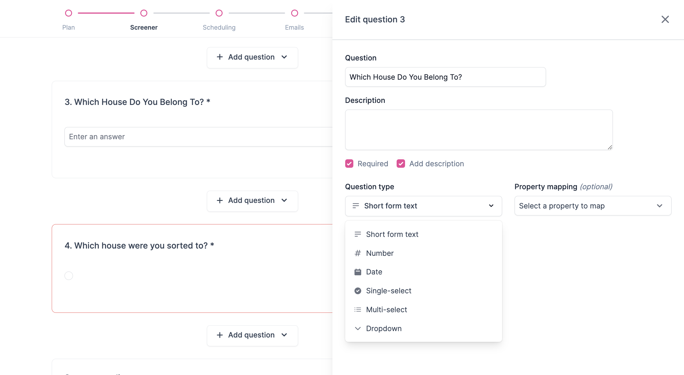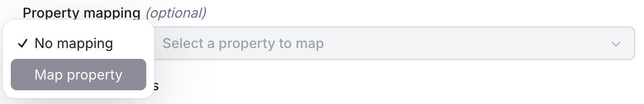 Property Mapping: Auto-associate question responses to specific properties by using the dropdown to select a property. This helps enrich person profiles continuously by having responses automatically update matching property values with any new or updated information, providing you with more data to better tailor your recruitment outreach.
