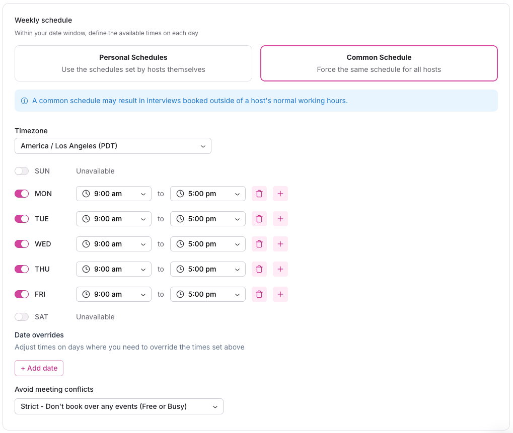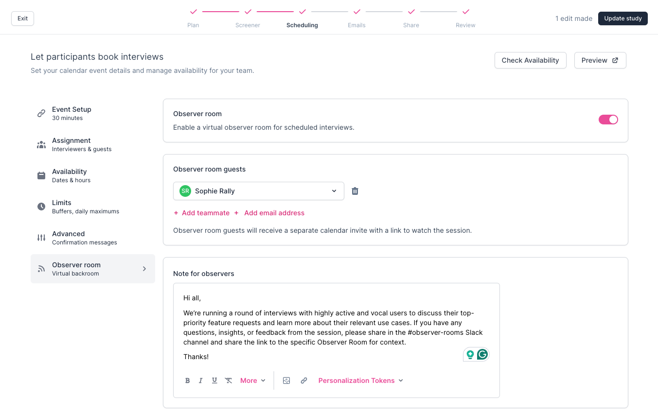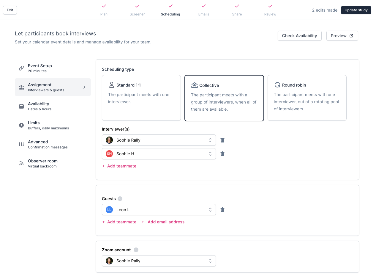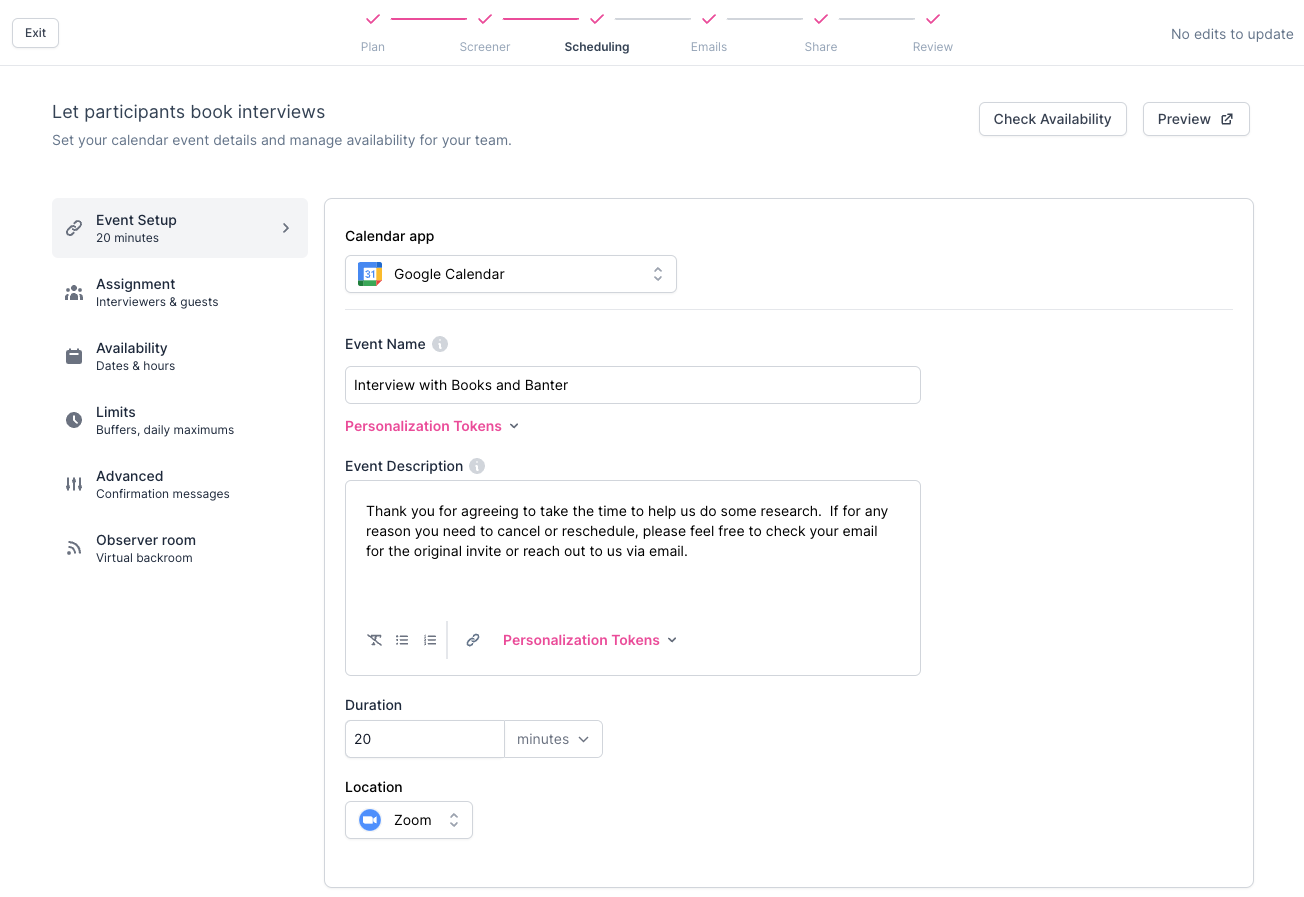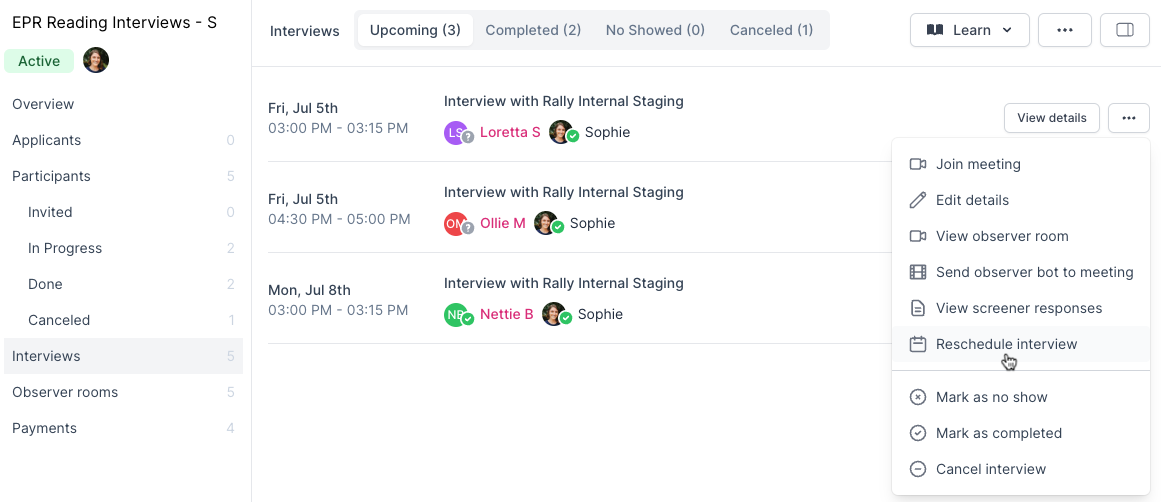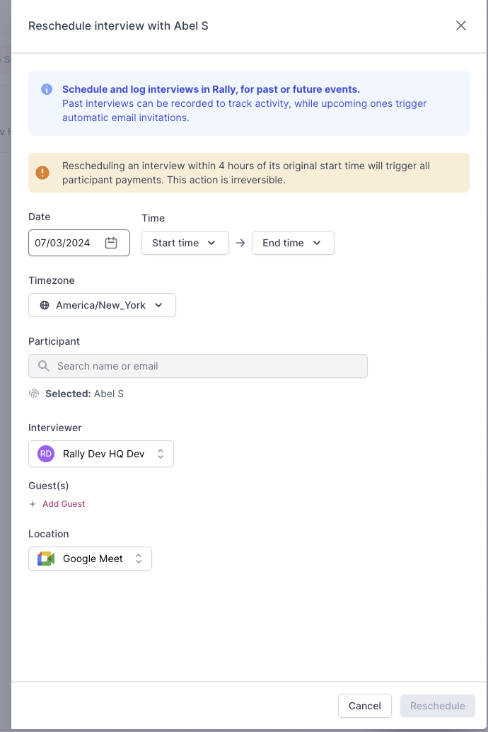 If there is a scheduling conflict or change in availability, you can manually reschedule the interview with the Participant, which automatically sends a reschedule email with details.