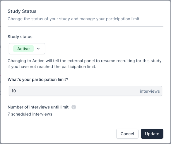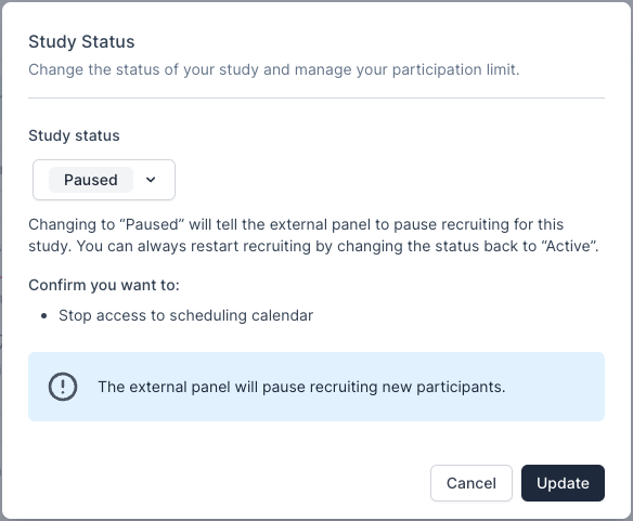Changing to “Paused” will tell the external panel to pause recruiting for this Study. You can always restart recruiting by changing the status back to “Active”.
