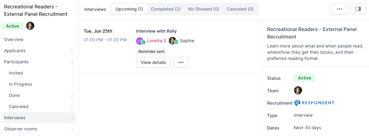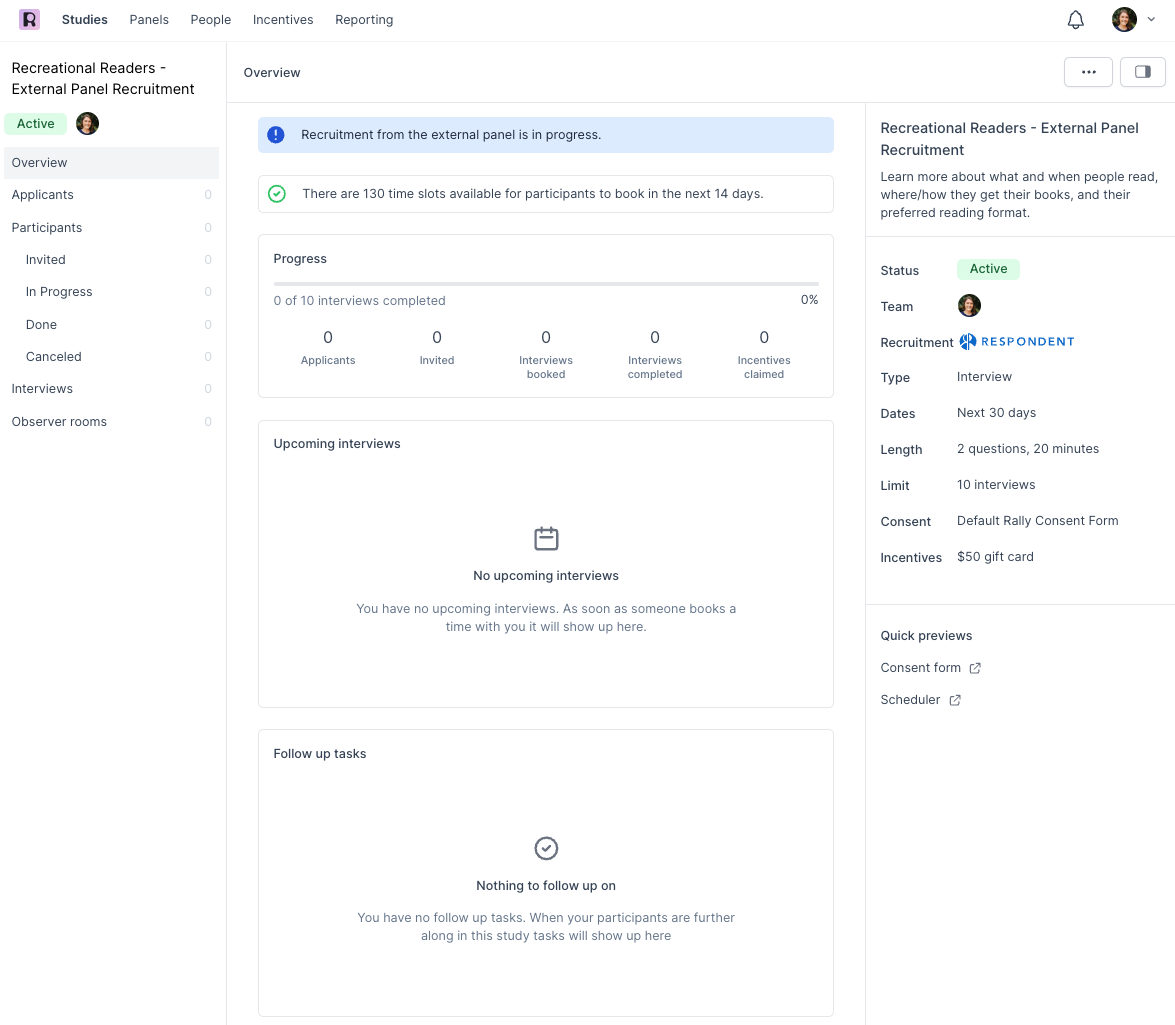 Recruiting Interview Study Participants with Rally's Respondent integration is quick and easy, allowing you to streamline researching with non-users. This entire process is completed in Rally. Learn more about the general workflow in the steps below.