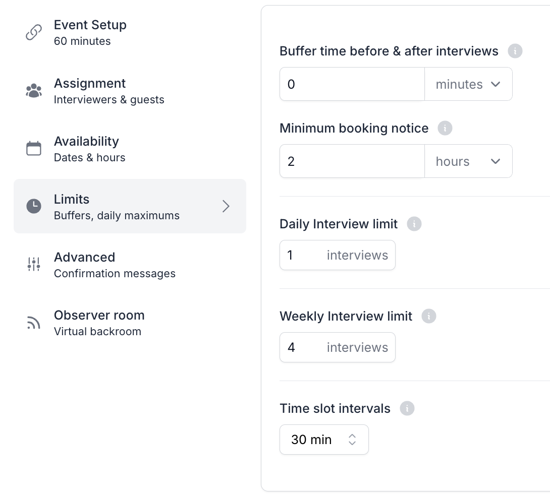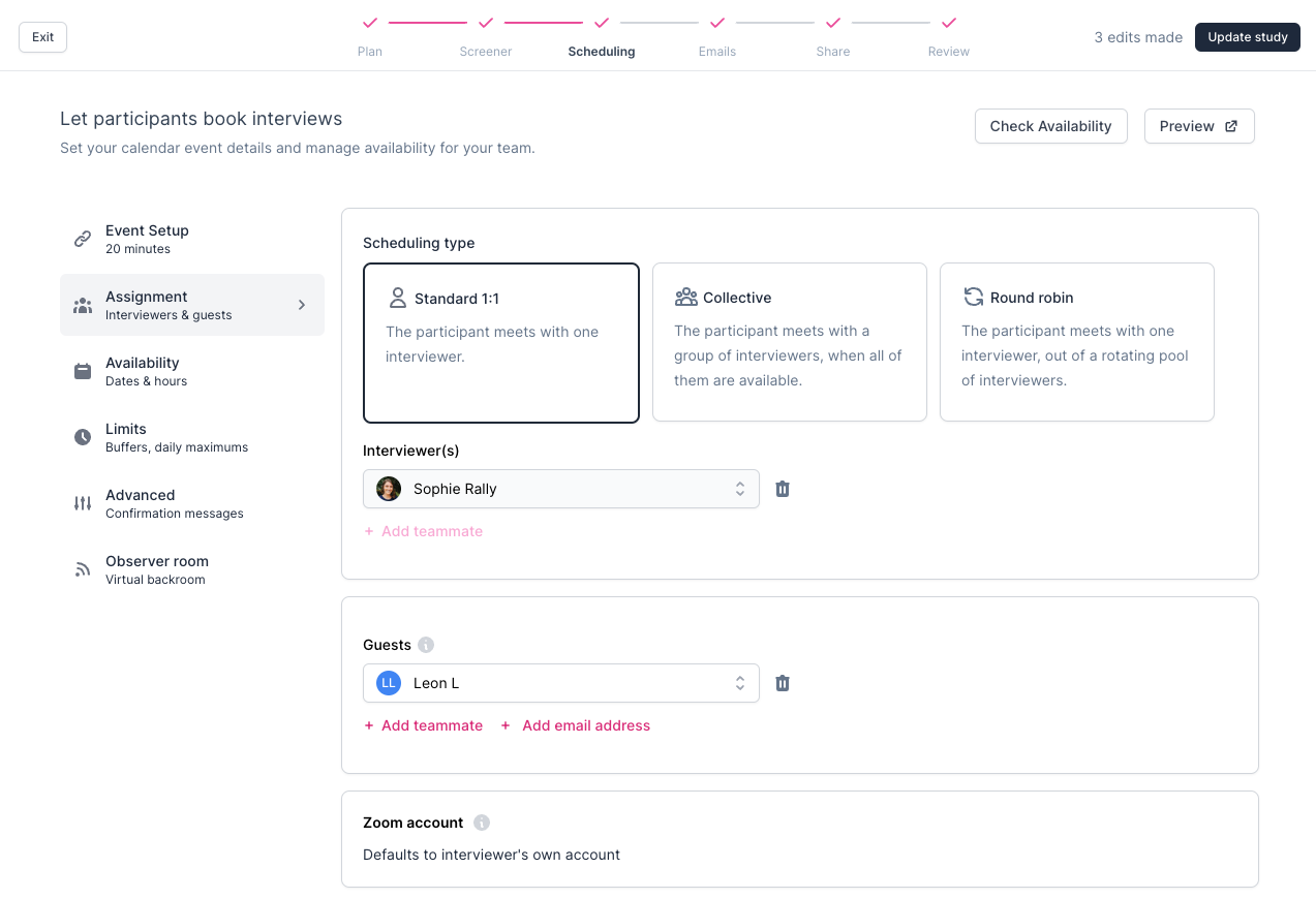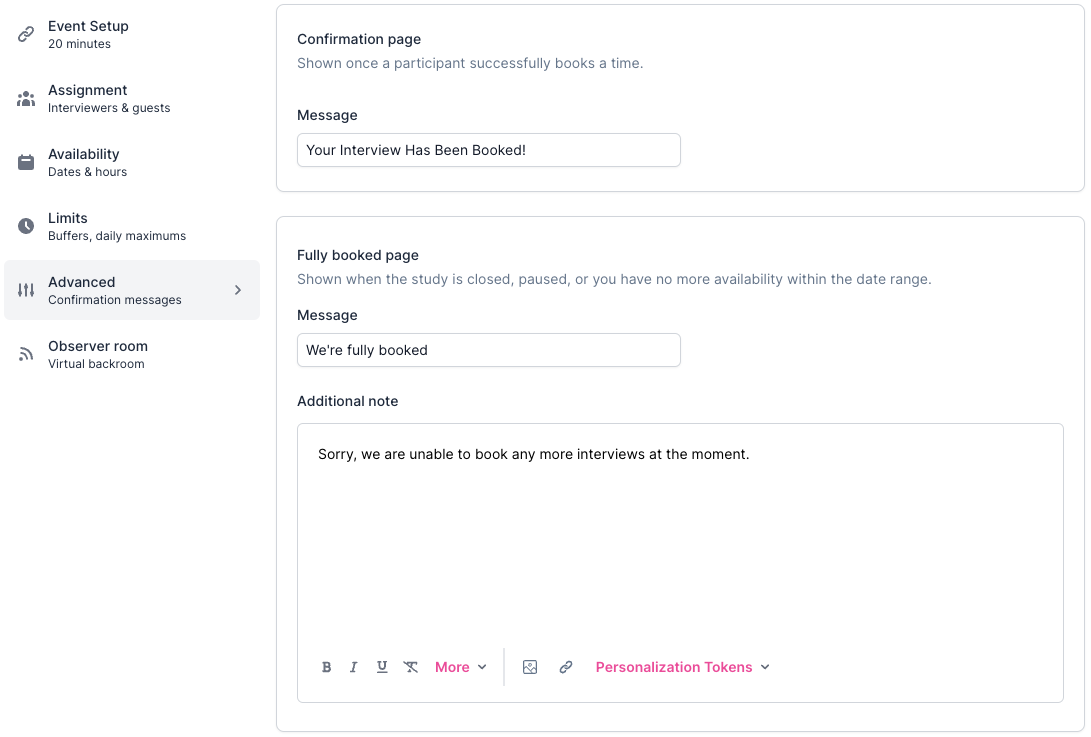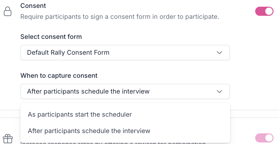 Consent (optional): You can add a consent form to ensure Participants understand and agree to Participate in your Study. Choose which consent form to use and determine its placement within the signup process by selecting when to capture consent as "As participants start the scheduler" or "After participants schedule the interview".