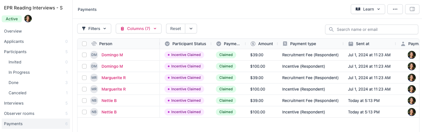 Select 'Payments' from the left side panel to view a complete log of payment activity, including the person, participant status, payment status, amount, sent at, and payment sender.