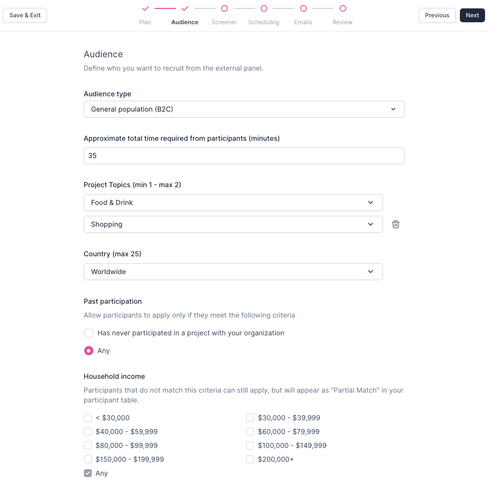 Household Income: Specify which income ranges to allow, or leave this as "Any" to broaden your search. Participants that do not match the criteria you set for this field can still apply, but will appear as "Partial Match" in your participant table.