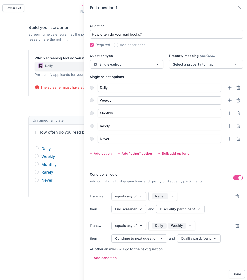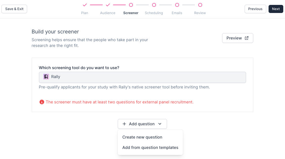 Ask qualifying questions to gather more information and "pre-qualify" or "disqualify" applicants for your Study with Rally's native screener tool before inviting them. The screener must have at least two questions for external panel recruitment, but Respondent has found that around 10 questions works best. You may want to include at least one open-ended question in order to assess how articulate and expressive a participant can be on your topic. We suggest including enough targeted questions to narrow your participant pool to only the most relevant candidates. Quality screeners are important to receive the best possible applicants for the specific research being done.