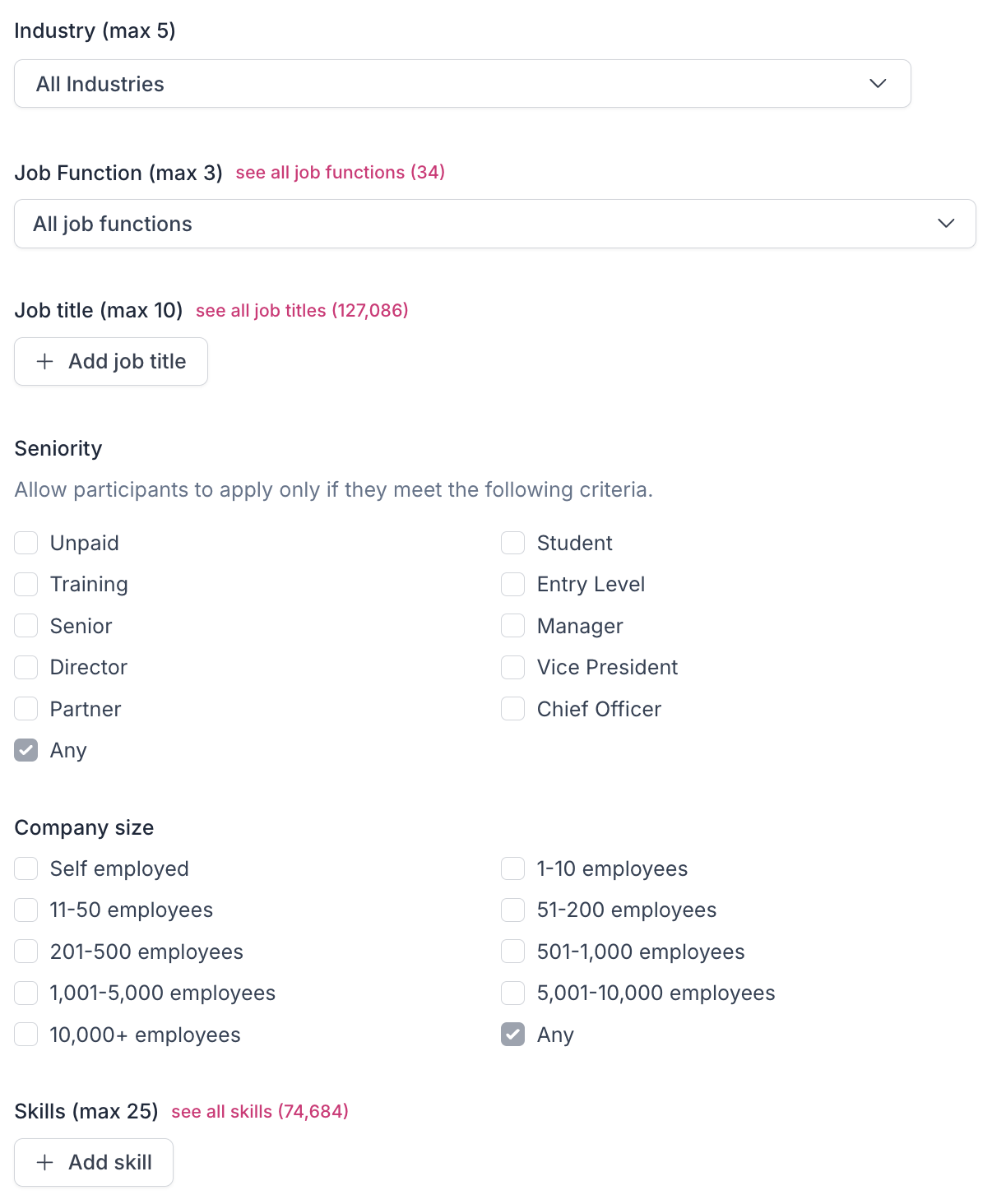 Company Size: Allow participants to apply only if they meet the selected criteria, or leave this as "Any" to broaden your search.