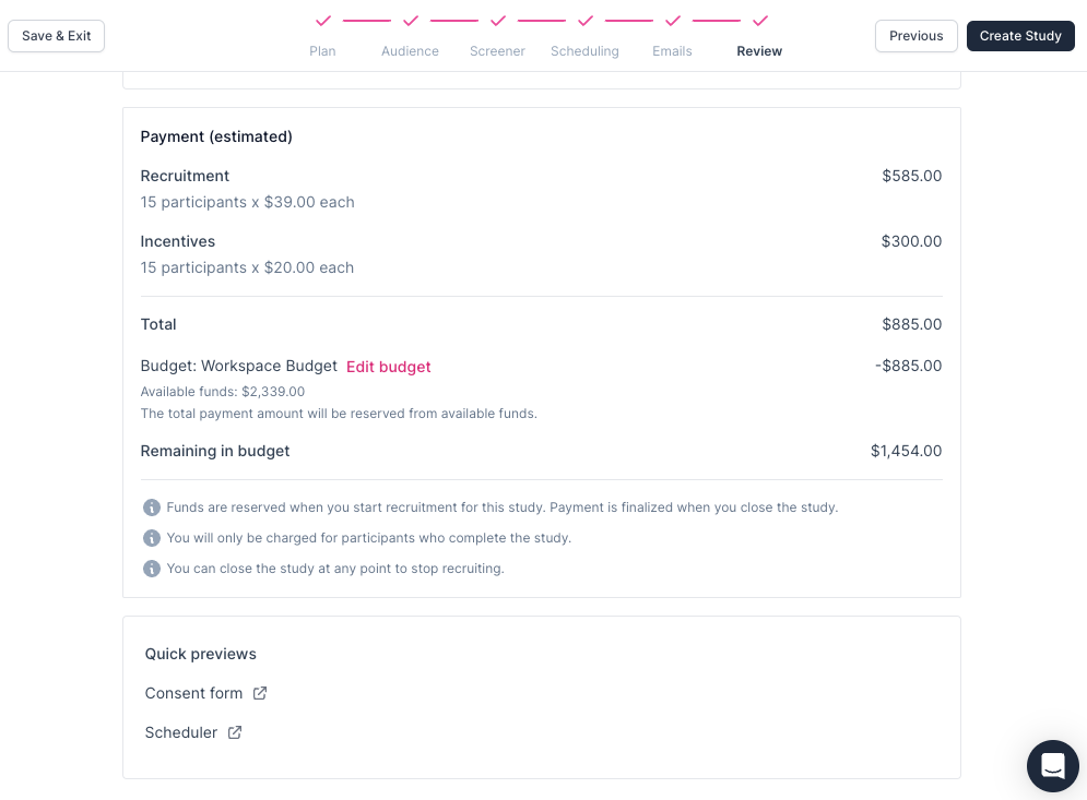 Note: Participation limit cannot be changed after you start recruitment. Consider setting the limit to the highest potential number of participants you may wish you invite, as you can always close your study early before the limit is met to stop recruitment, finalize payment, and release the remaining unused reserved funds.