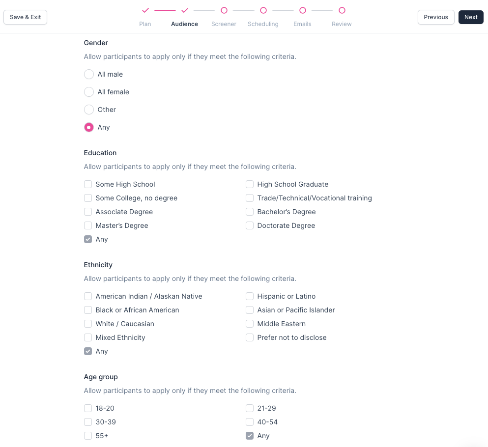 Ethnicity: Allow participants to apply only if they meet the selected criteria, or leave this as "Any" to broaden your search.