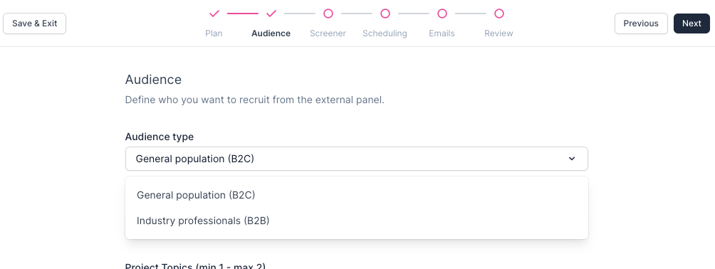 For guidance deciding between Industry Professionals (B2B) or General Population (B2C) Participants, and to learn best practices for recruitment, visit our guide:
