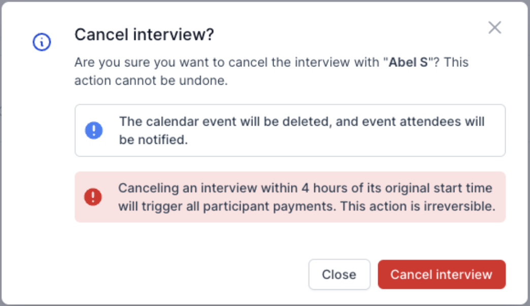 Canceling an interview within 4 hours of its original start time will trigger all participant payments. This action is irreversible. Use caution before confirming.