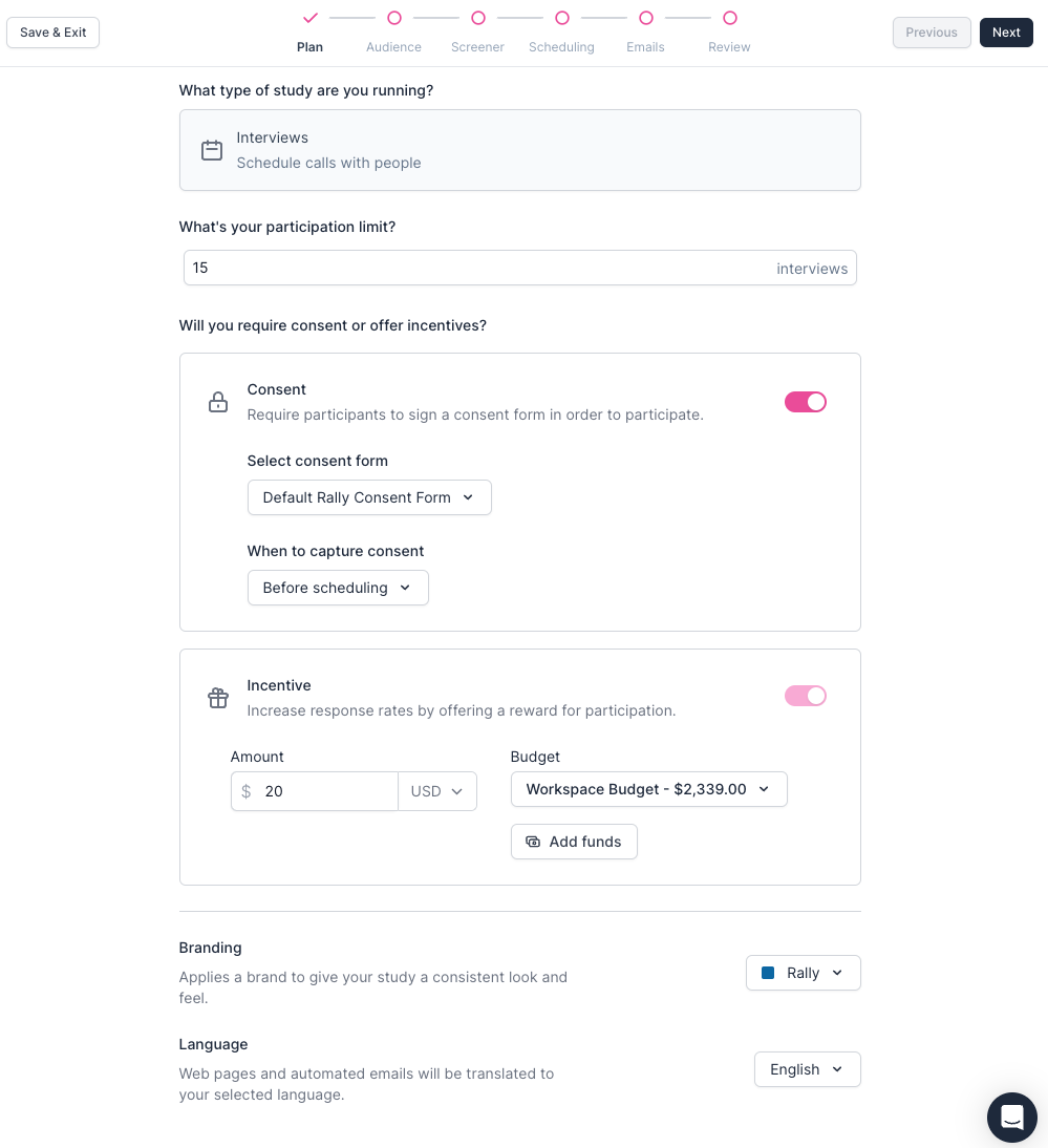 Note: Web pages and automated emails will be translated by Rally to your selected language, but any customizable elements that your team creates or includes (such as custom screener and survey questions or question templates, custom emails or email templates, and consent forms) will not be automatically translated by Rally and should be prepared in advance by your team.