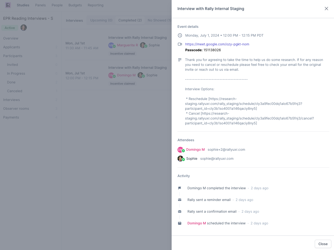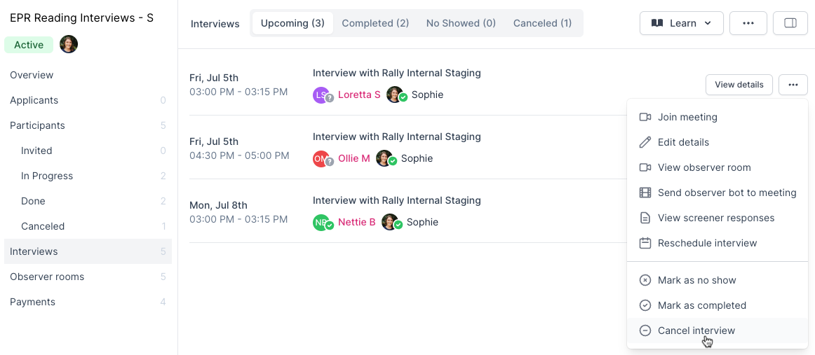 If for any reason you need to cancel an interview, you can manually reschedule the interview with the Participant. We suggest exercising caution when canceling interviews as this action cannot be undone. Where relevant, consider rescheduling instead if you'd like to retain access to this participant within the Study.