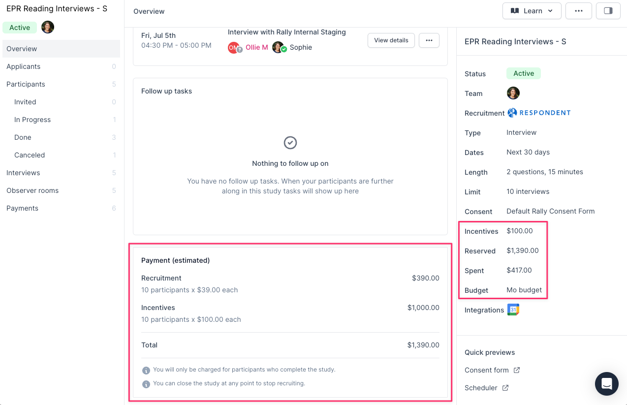 While a combined total spent so far on this Study is visible from the Study Details right side panel throughout, you can also view all completed payments within the Study.