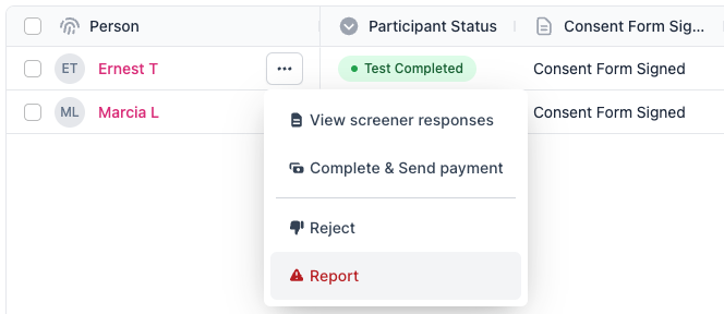 If needed, you can anonymously report a Participant for misrepresenting themselves or providing false information. This Participant will be removed from this Study and will not appear in future projects with your workspace. Additionally, their account may be subject to disciplinary action by Respondent, which could include suspension or permanent removal.
