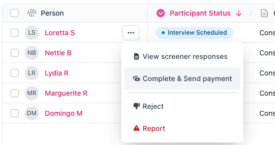 Manually mark a Participant as complete and immediately send payment after completing a successful interview. Be cautious as this action is irreversible and we cannot issue refunds if you report or reject the Participant after payment has been made.