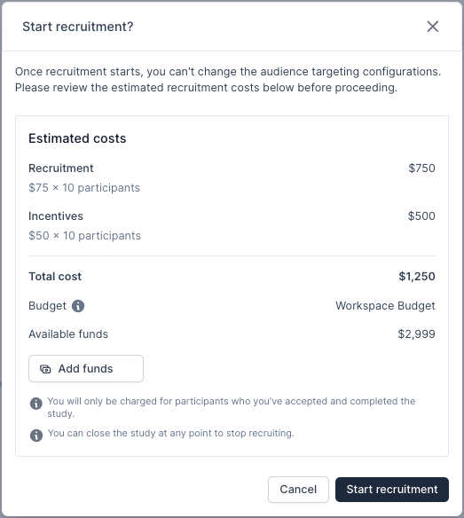 🚨 Participation limit cannot be increased after you start recruitment. Consider setting the limit to the highest potential number of participants you may wish you invite, as you can always close your study early before the limit is met to stop recruitment, finalize payment, and release the remaining unused reserved funds.