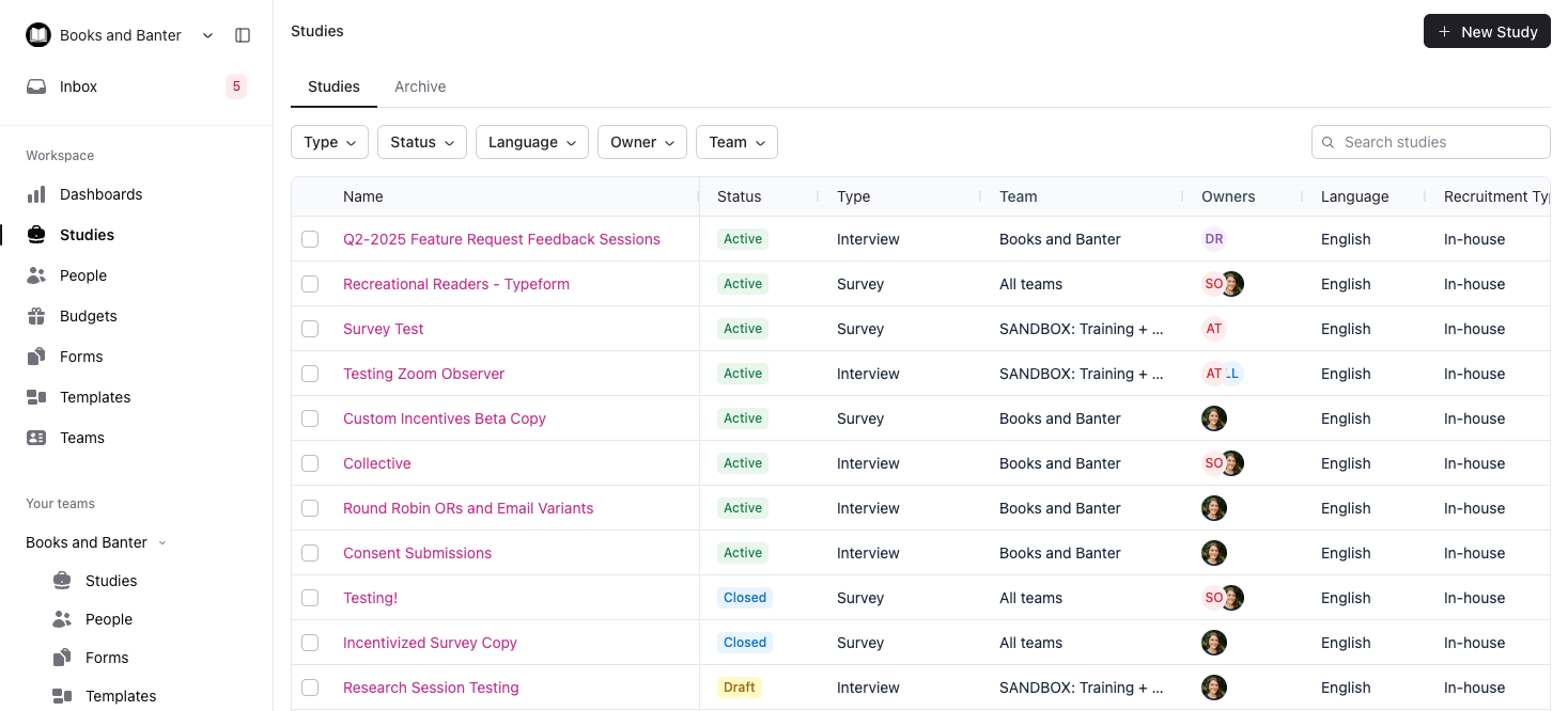 We recommend opening Studies within the Team you plan to create the Study in, but this can also be done from the Workspace level Studies page.